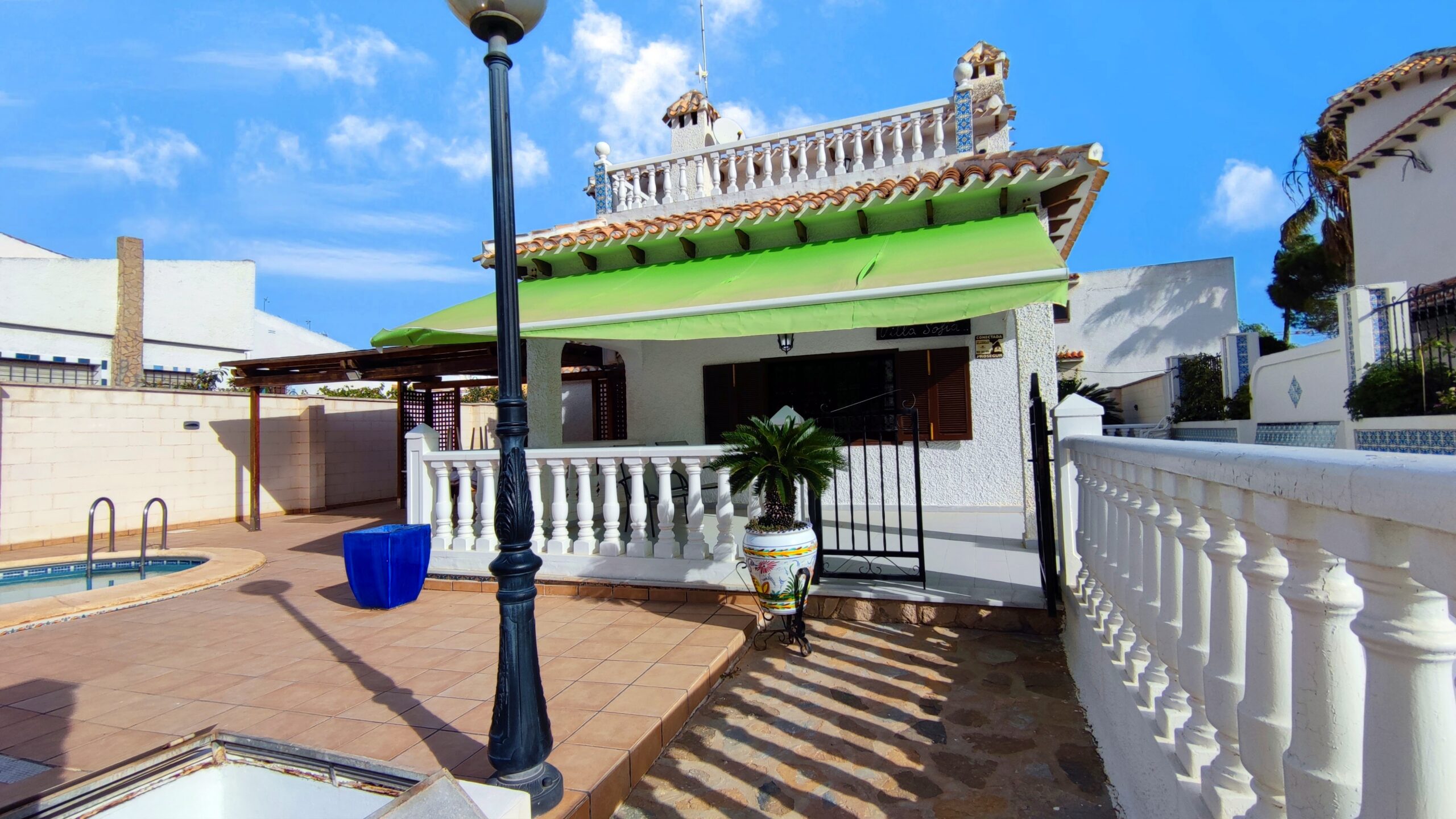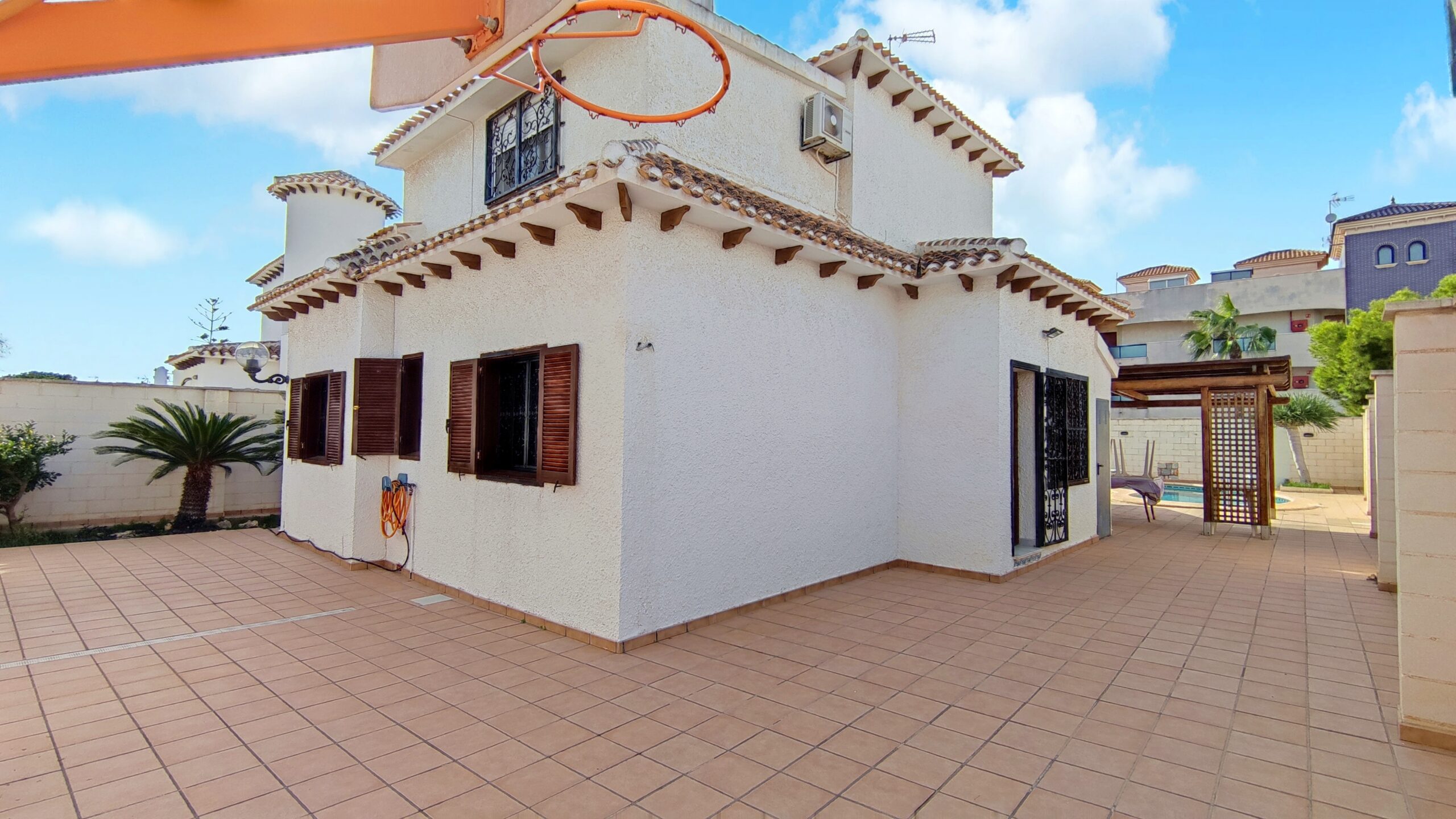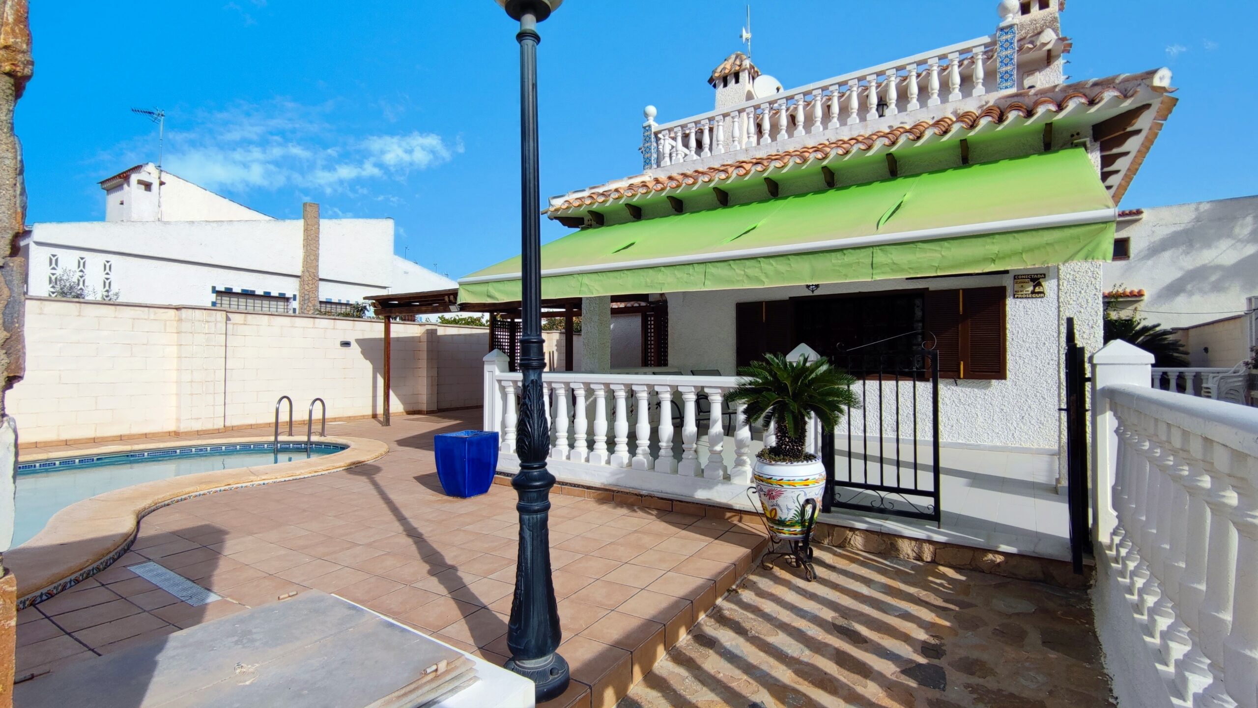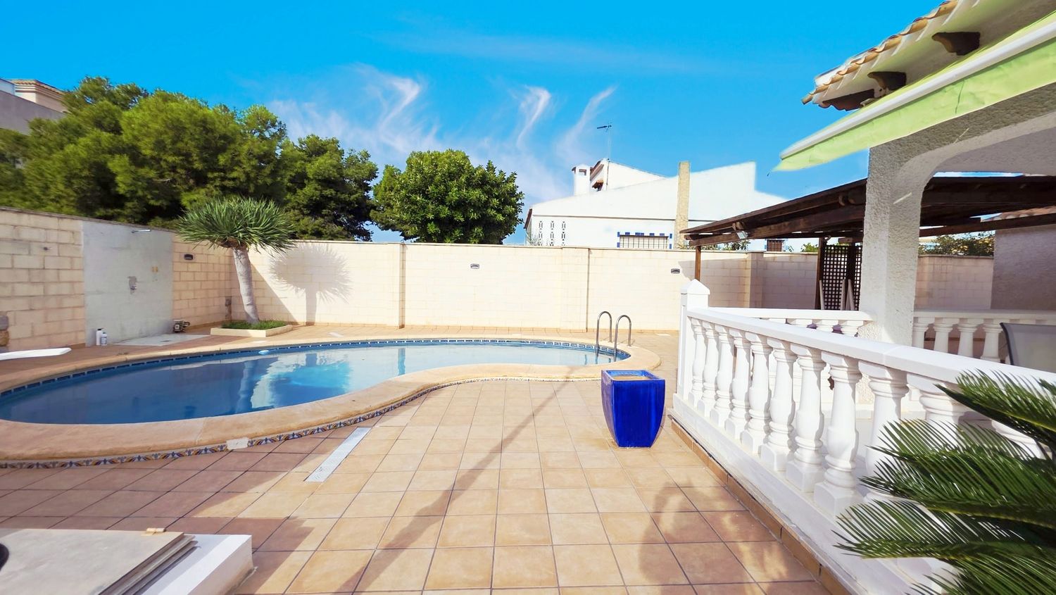 La casa cuenta con un amplio patio exterior embaldosado que rodea toda la vivienda, con porche cubierto con pérgola, piscina privada de agua salada de 28 m² y zona de ducha, perfecta para disfrutar del clima mediterráneo durante todo el año.