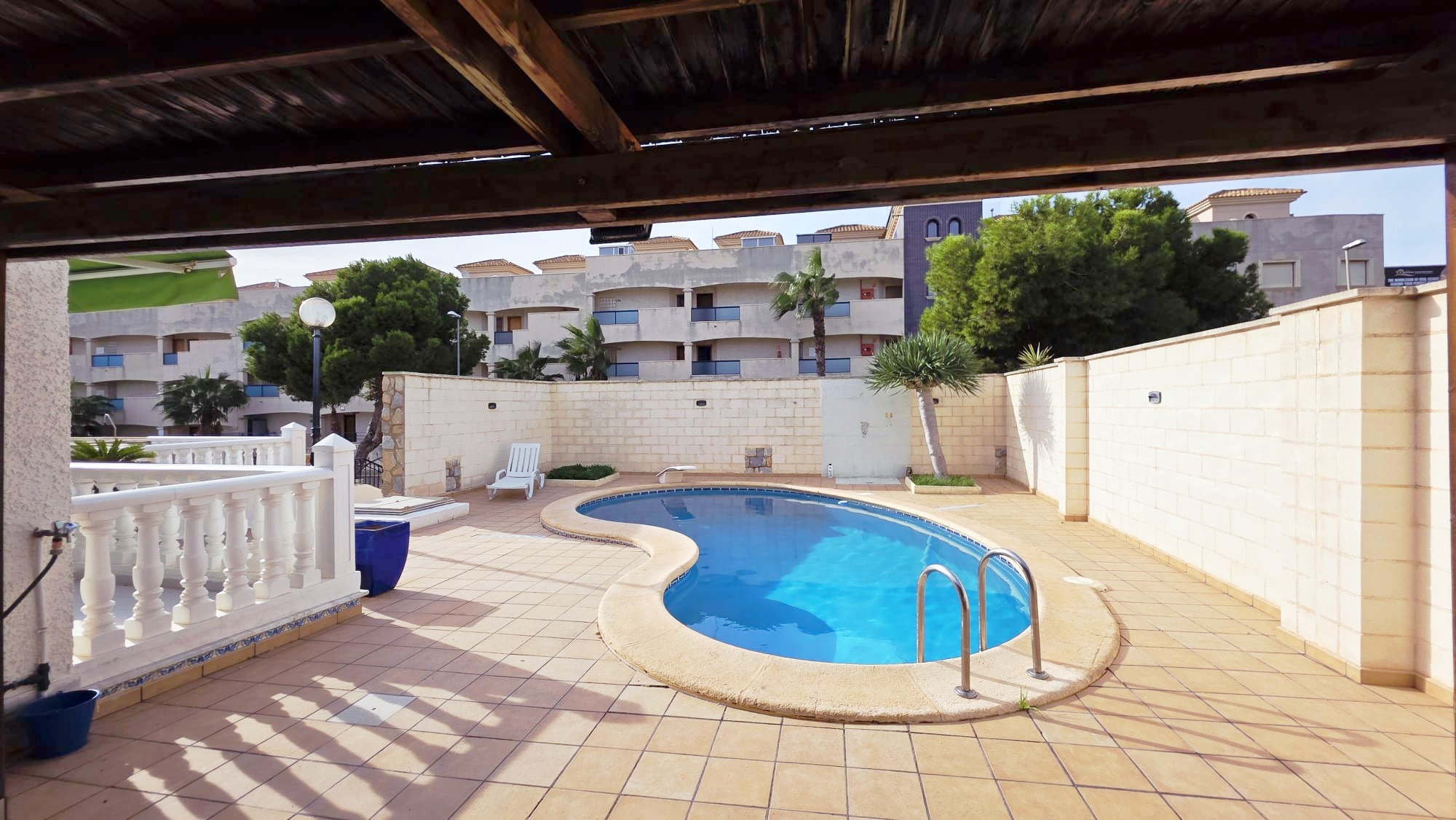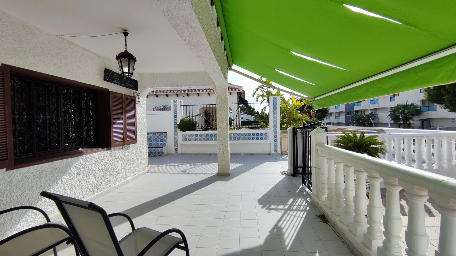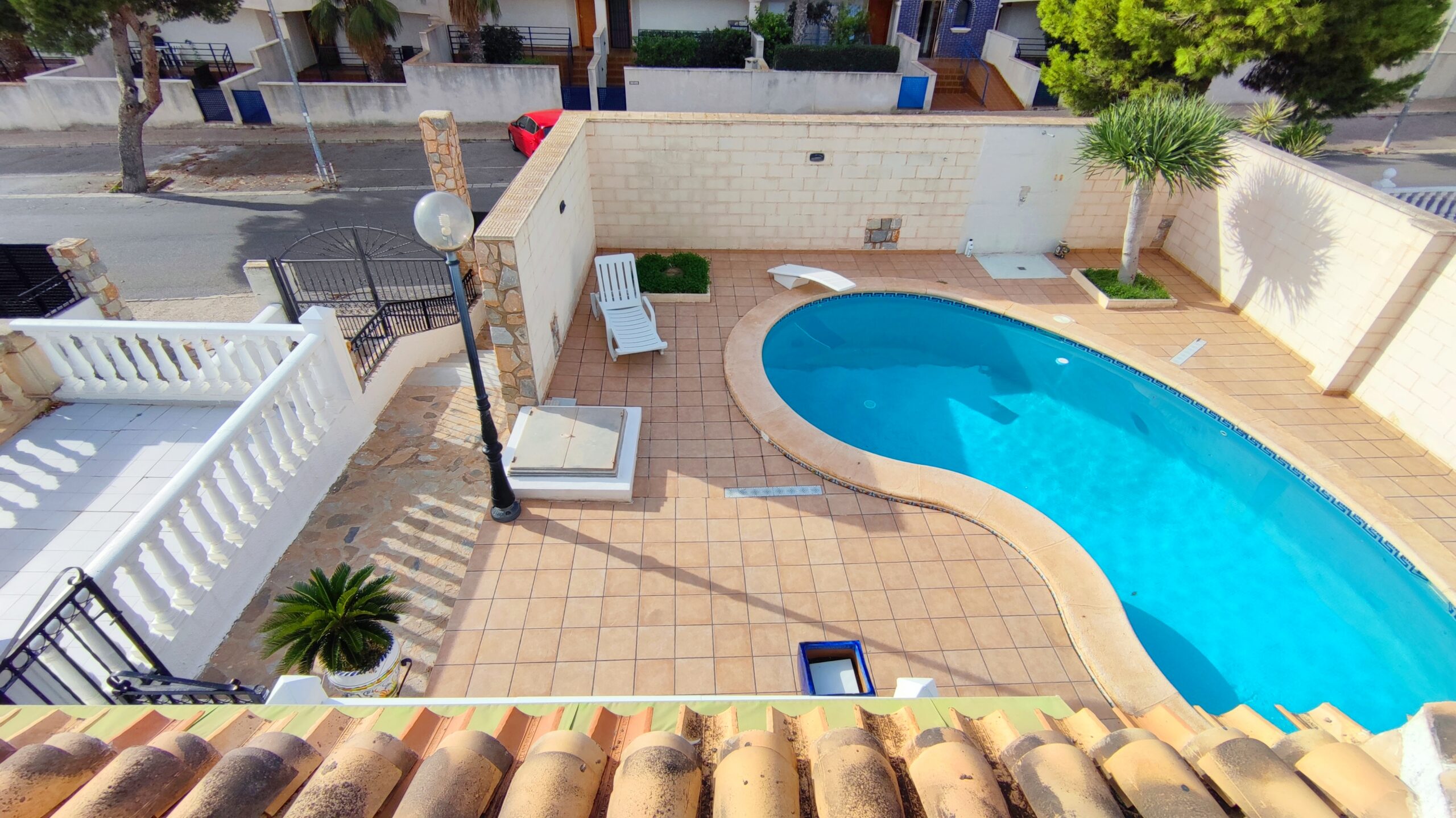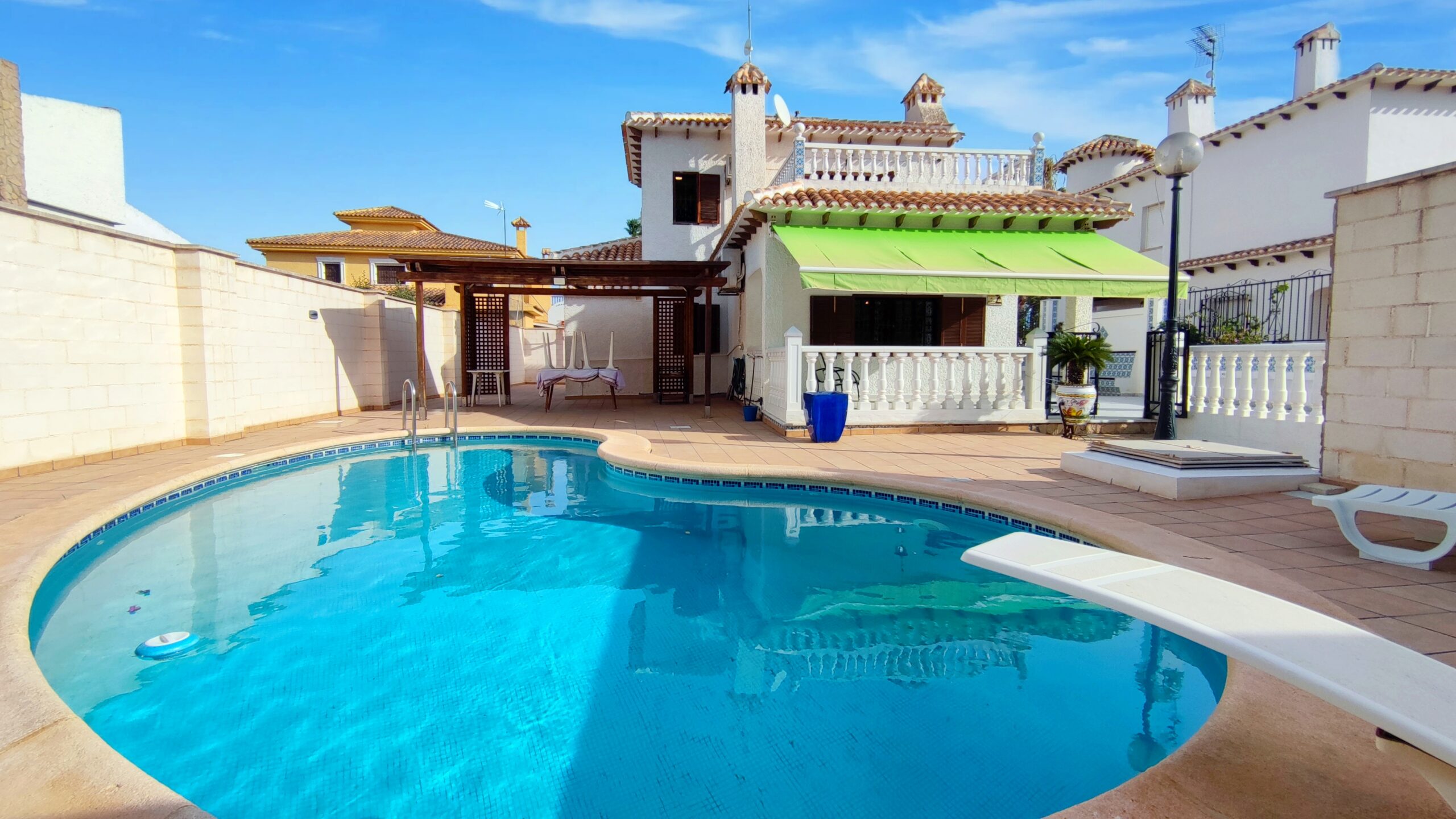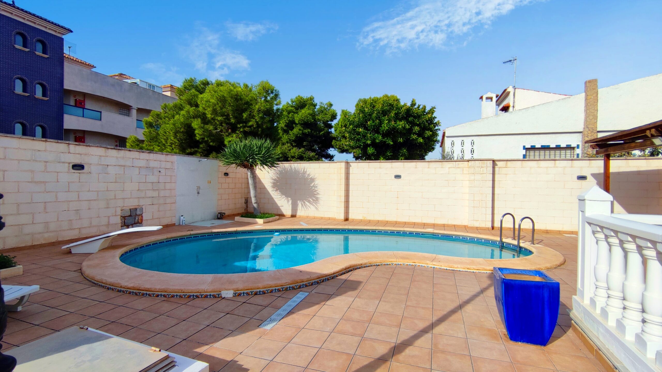 La casa cuenta con un amplio patio exterior embaldosado que rodea toda la vivienda, con porche cubierto con pérgola, piscina privada de agua salada de 28 m² y zona de ducha, perfecta para disfrutar del clima mediterráneo durante todo el año.