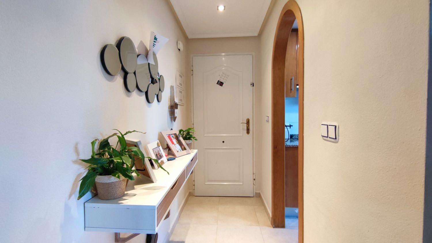 El interior ofrece un ambiente acogedor y funcional. Cuenta con dos luminosas habitaciones provistas de armarios empotrados, un baño completo con ducha de hidromasaje y un salón-comedor muy agradable que se integra de manera armoniosa con una cocina office independiente, totalmente equipada y amueblada con gusto.